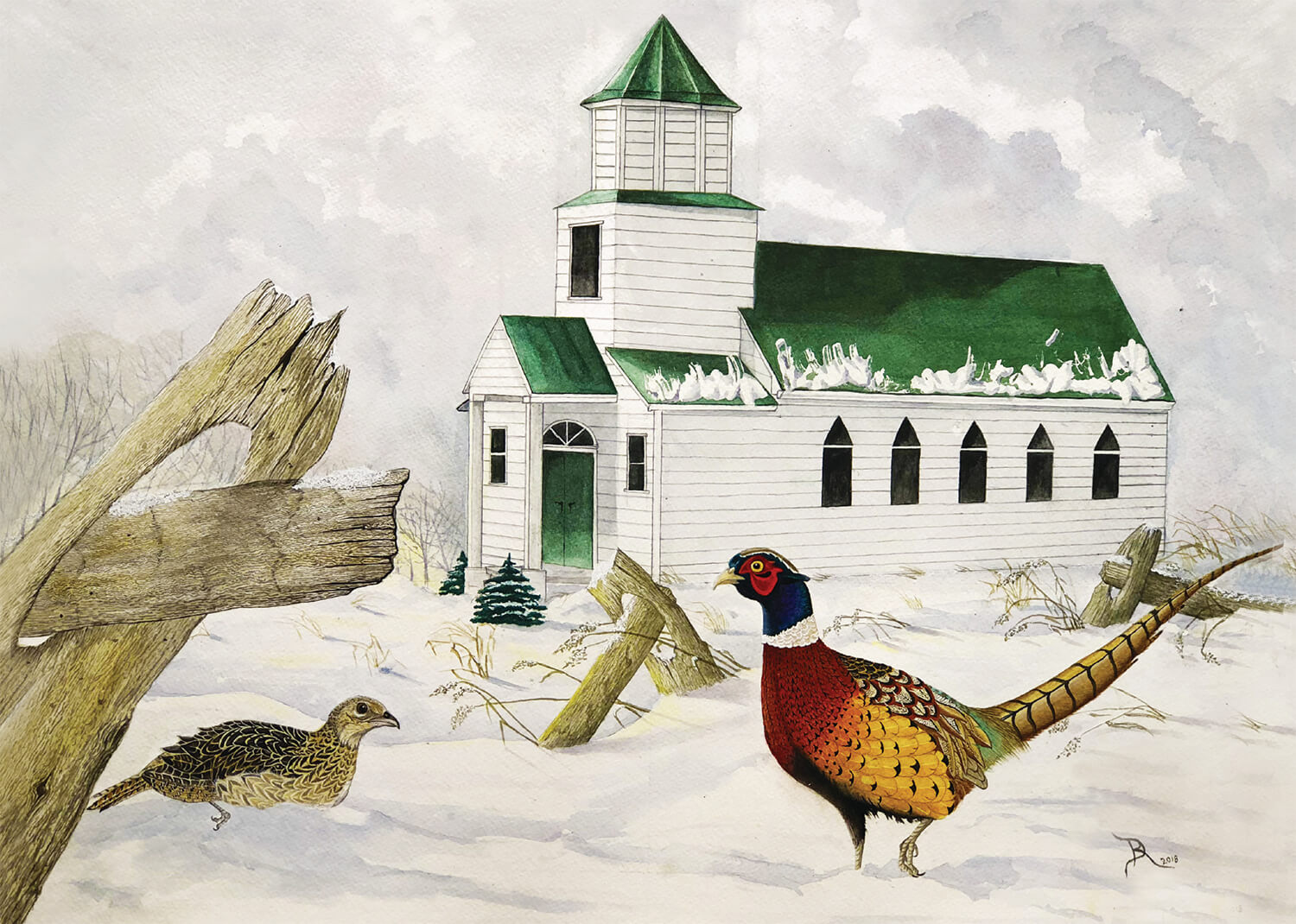 Ray brings together the little church in Nisland, SD, with a pair of ringneck pheasants in the winter.