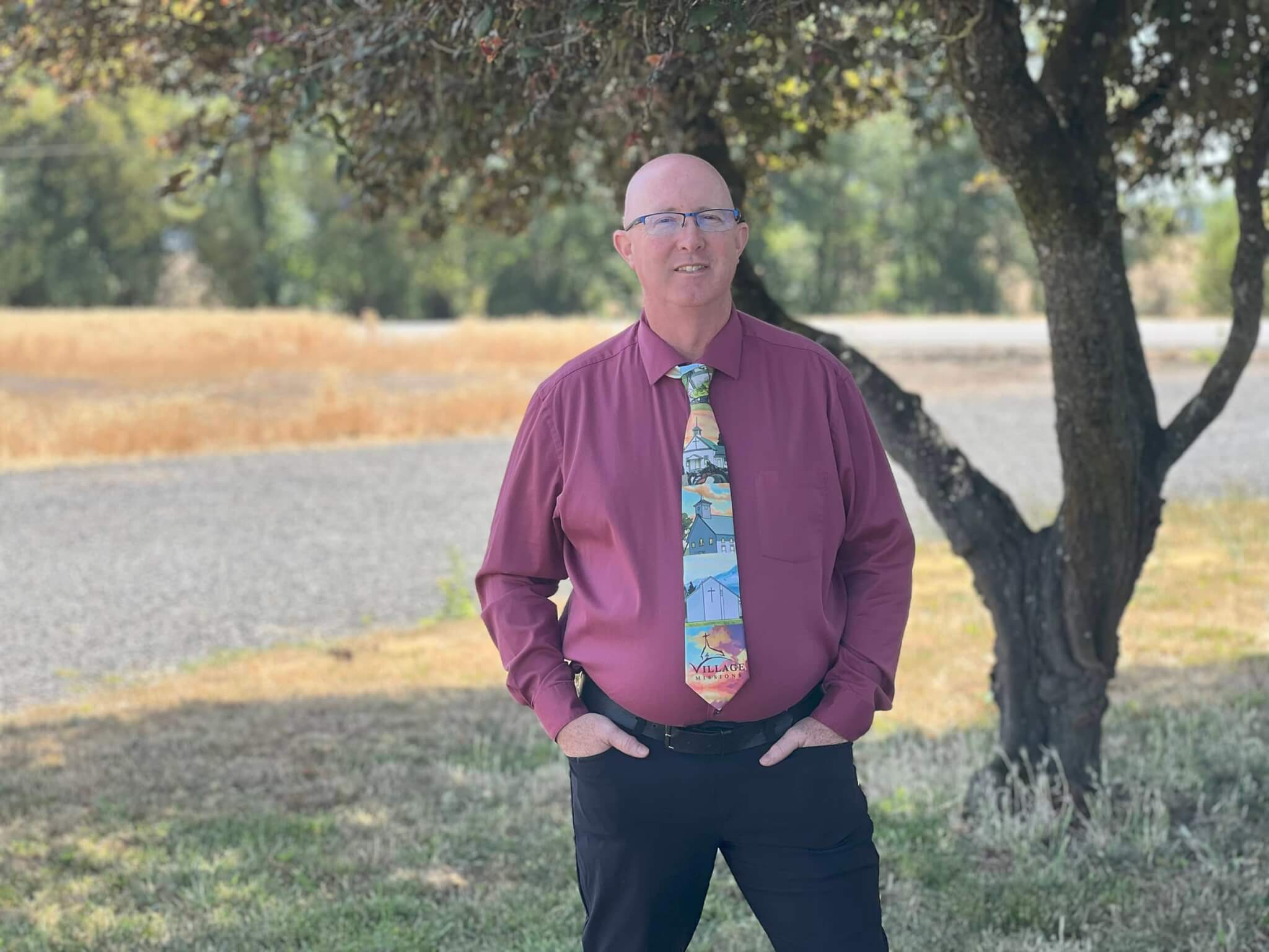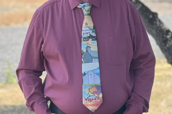 Necktie with illustrations of several VM partner churches.
