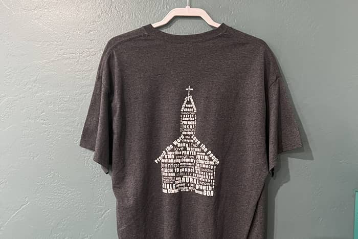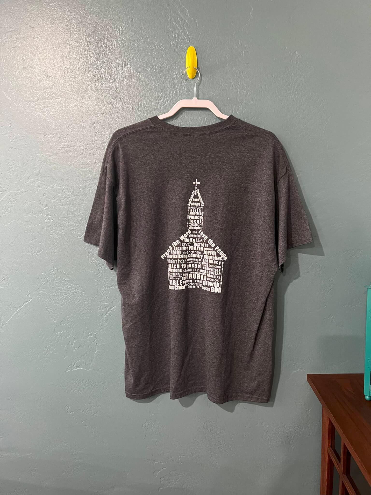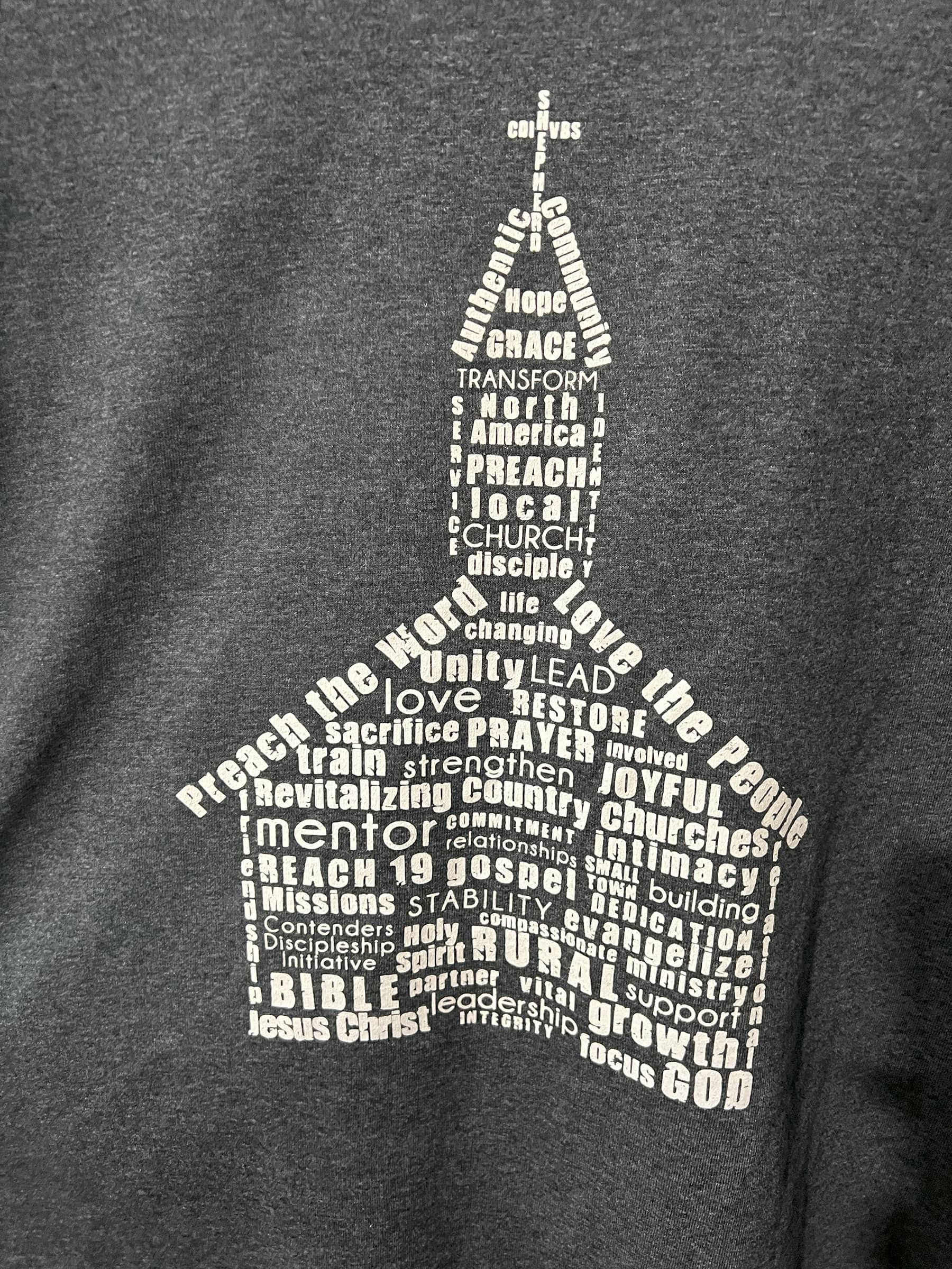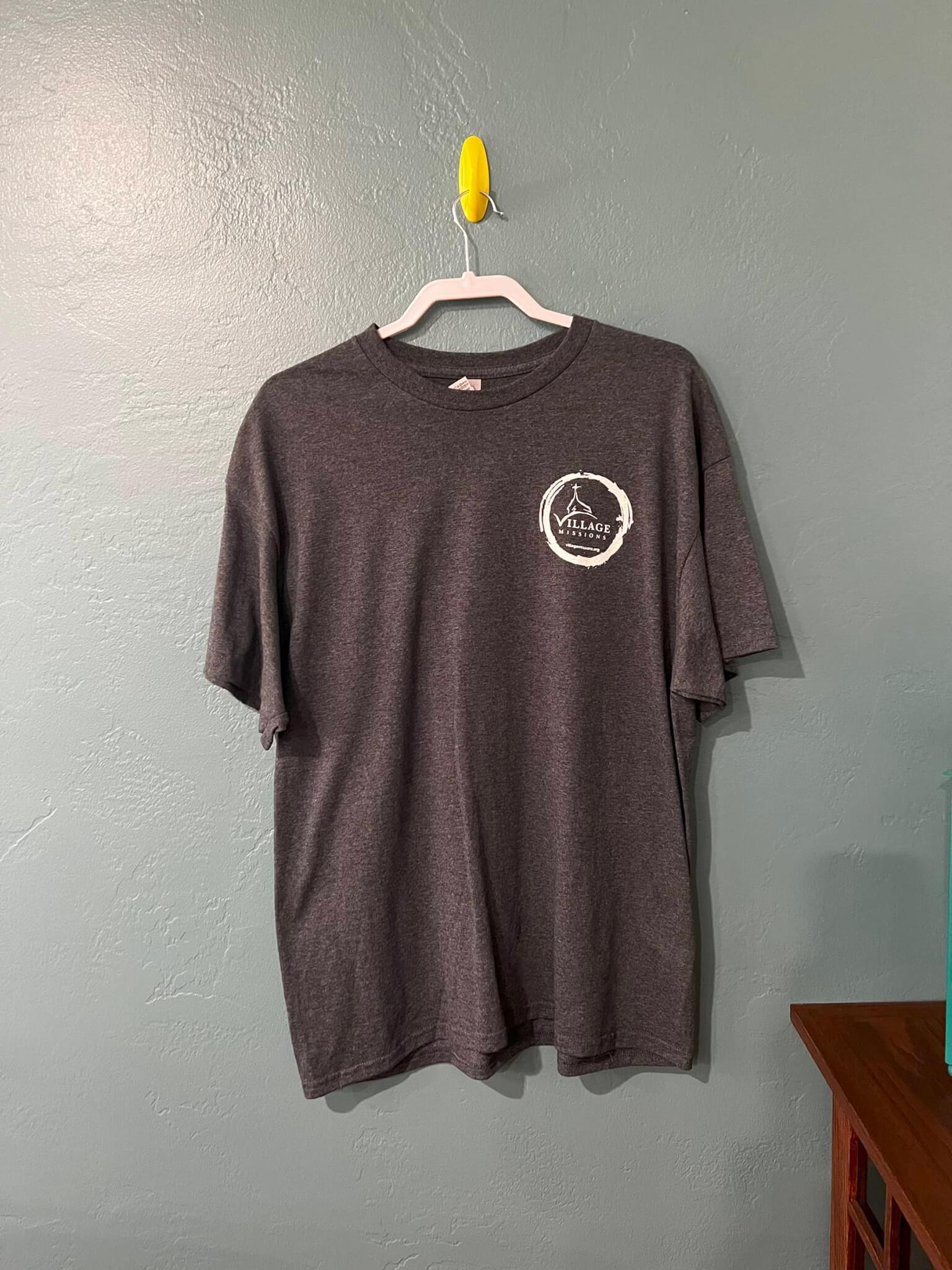 VM logo on front chest and church word art on back. Light Grey. (Cotton)